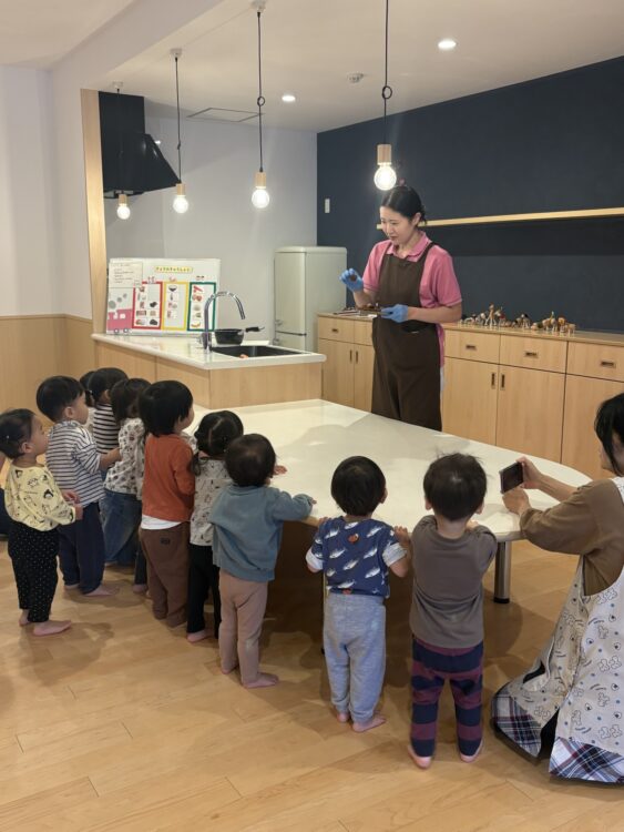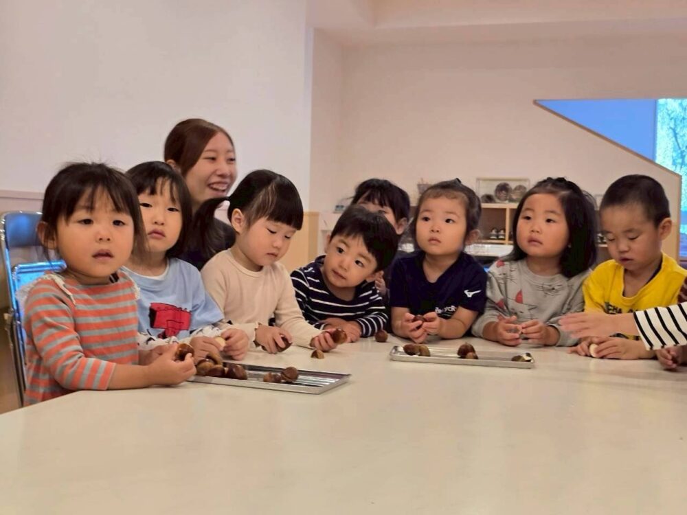 栄養士の宮崎さんにこども園の栗を剥いてもらい中身を見たり匂いを嗅いだり…秋の味覚は楽しいことが沢山です