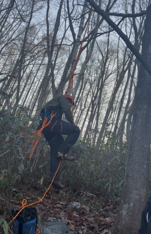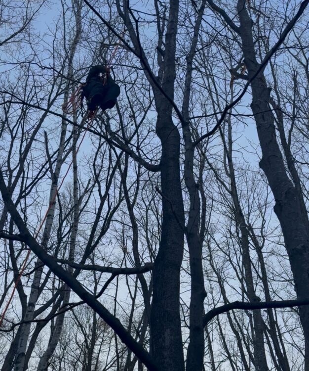 高い木に登り、枯れかかった木の枝を切る作業をしていました